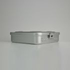 حاويات التعقيم المسطحة, صناديق ذات فلتر وتمنع تسرب الماء والهواء, تستخدم لتعقيم الأدوات والمعدات الجراحية الدقيقة. الجسم الرئيسي للصناديق والاغطية مضغوط بالمكبس من الالمنيوم 1050 عالي الجودة على شكل قطعة واحدة ولايستخدم اللحام أثناء انتاج الصناديق والاغطية. تطبق عملية الحماية الانودية للصناديق والاغطية لزيادة مقاومتها ضد المؤثرات الخارجية. يوجد عدة خيارات لألوان الأغطية. يوجد ثقوب للهواء على سطح الغطاء. ختم من السيليكون يمنع مرور الماء والهواء يوضع على الحواف, حامل فلتر قابل للقفل من الحديد المقاوم للصدأ / الألمنيوم / البلاستيك مع ختم مانع للتسرب حوله, يحمل الفلاتر المتوضعة في مكان مركزي على الوجه الداخلي للغطاء, يقوم بفلترة الهواء الذي يمر عبر الثقوب الى داخل الصندوق, أقفال نابضية على الجانبين. يوجد أماكن مخصصة للوحات الاسمية, ومقابض للحمل, واجزاء قفل تمر من خلالها الأقفال البلاستيكية التي تستخدم مرة واحدة. وسادة سيليكون, السلال الصفائحية المثقبة, السلال السلكية, الفلاتر الورقية, فلاتر التفلون, والملصقات الاسمية جميعها تستخدم كمواد مساعدة مع حاويات التعقيم. مصنّعة بأنواع و أحجام مختلفة مصممة مسبقا لتلائم احتياجات المستخدم. يوجد خيارات للصناديق ان تكون مثقبة او بدون ثقوب, ومع فلاتر وحوامل فلاتر كالتي تستخدم في الغطاء.
