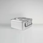 حاويات التعقيم الطبية صغيرة الحجم نظام صمام بدون فلتر, تستخدم لتعقيم وتخزين ونقل الأدوات والمعدات الجراحية ومستلزمات الجراحة العظمية والانسجة. تتكون من جزئين رئيسيين: الحاوية والغطاء. الجسم الرئيسي للصناديق والاغطية مضغوط بالمكبس من الالمنيوم 1050 عالي الجودة على شكل قطعة واحدة ولايستخدم اللحام أثناء انتاج الصناديق والاغطية. تطبق عملية الحماية الانودية للصناديق والاغطية لزيادة مقاومتها ضد المؤثرات الخارجية. يوجد عدة خيارات لألوان الأغطية. يوجد ثقوب للهواء على سطح الغطاء. ختم من السيليكون يمنع مرور الماء والهواء يوضع على الحواف, حامل فلتر قابل للقفل من الحديد المقاوم للصدأ / الألمنيوم / البلاستيك مع ختم مانع للتسرب حوله, يحمل الفلاتر المتوضعة في مكان مركزي على الوجه الداخلي للغطاء, يقوم بفلترة الهواء الذي يمر عبر الثقوب الى داخل الصندوق, أقفال نابضية على الجانبين. يوجد أماكن مخصصة للوحات الاسمية, ومقابض للحمل, واجزاء قفل تمر من خلالها الأقفال البلاستيكية التي تستخدم مرة واحدة. وسادة سيليكون, السلال الصفائحية المثقبة, السلال السلكية, الفلاتر الورقية, فلاتر التفلون, والملصقات الاسمية جميعها تستخدم كمواد مساعدة مع حاويات التعقيم. مصنّعة بأنواع و أحجام مختلفة مصممة مسبقا لتلائم احتياجات المستخدم. يوجد خيارات للصناديق ان تكون مثقبة او بدون ثقوب, ومع فلاتر وحوامل فلاتر كالتي تستخدم في الغطاء. نموذج الصمام أو الحاجز الحيوي هو نظام فلترة ميكانيكي, في هذا النظام التفكيك المناسب والأسهل لغطاء حاويات التعقيم. نظام الصمام الميكانيكي في الغطاء يسمح للبخار بالدخول وتأمين التعقيم مع الضغط المطبق. الشكر لهذا النظام, حيث لاحاجة لاستخدام الفلاتر. نظام مريح ويؤمن تعقيم لفترات أطول وأكثر ملائمة لما بعد التعقيم, كل الشكر لمبتكر نظام الصمام.